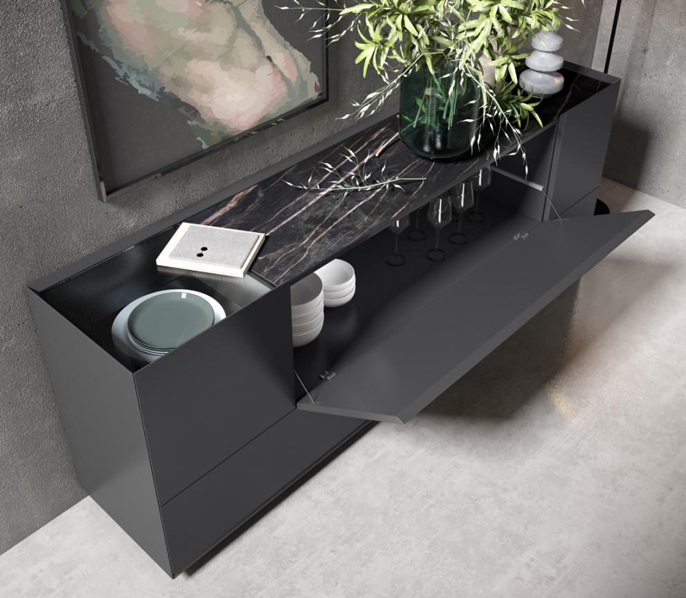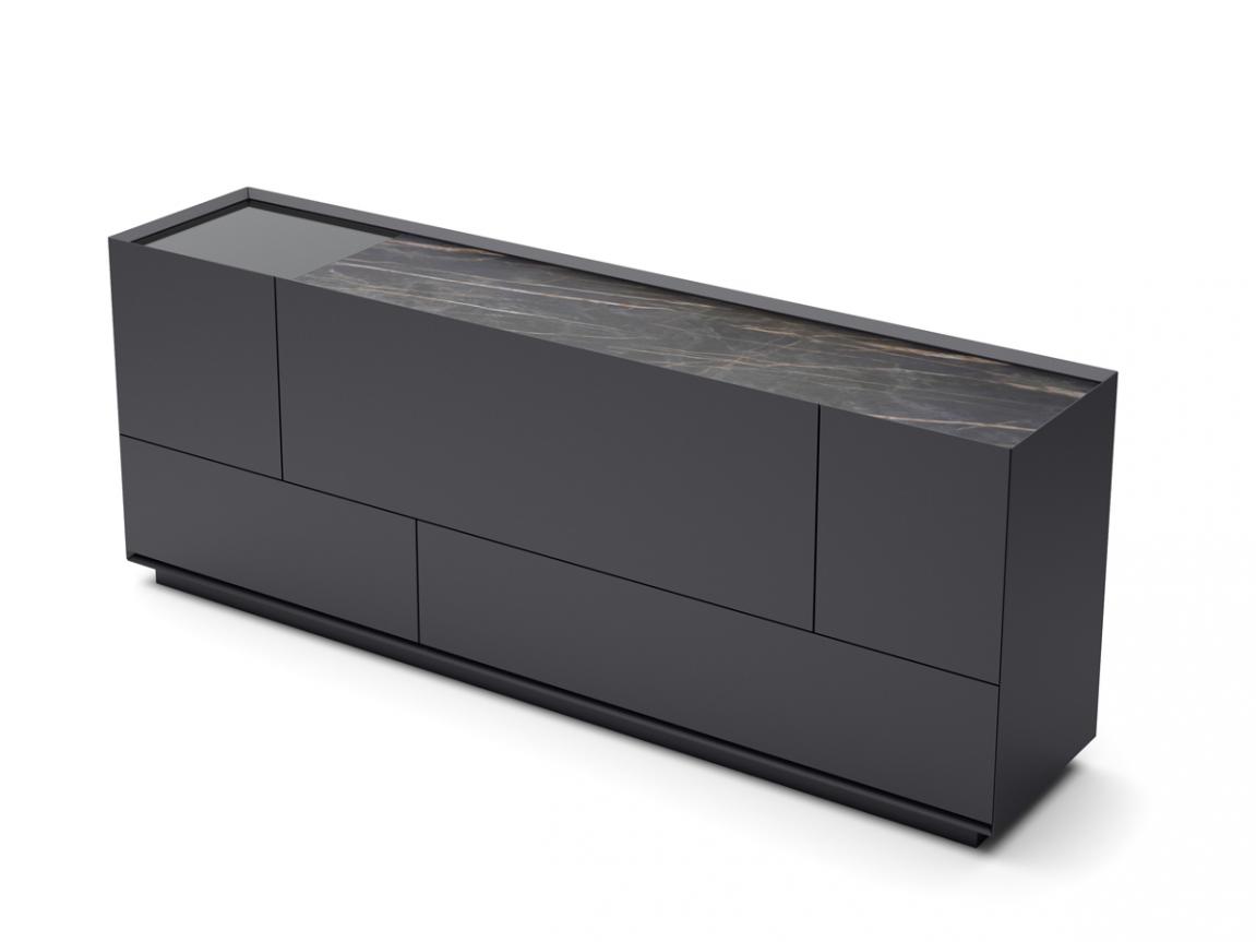 Made in three sizes, from 175cm to 225cm. The sideboard itself is available in a huge choice of matt lacquers colours, or in a wide range of wood finishes. The ceramic has a matt finish, & is available in a number of finishes, including stone & marble look (shown here in Noir Desir)