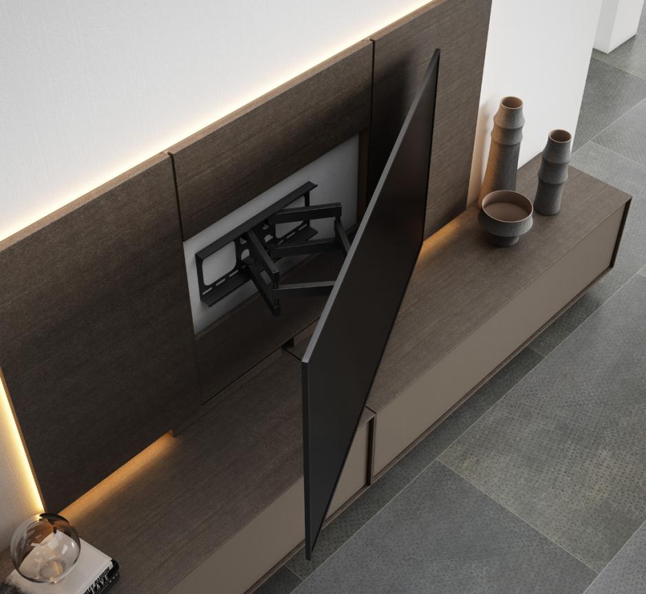 This clever contemporary TV unit includes an integrated, non wall mounted LED lit back panel to surround the television, giving it the look of a high end wall unit - though the TV bracket is actually connected to the wall behind it, so the unit can be moved & doesnt require installation.