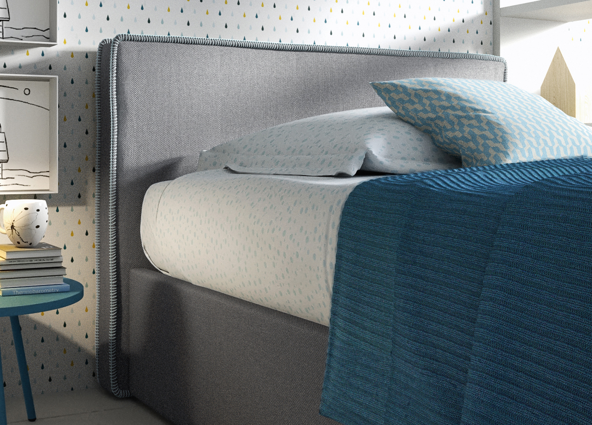 Made in Italy, this bed is fully upholstered in a selection of fabrics, or practical ecoleather, with up to the minute contrasting blanket stitch on the headboard. The blanket stitch is available in all of Battistella's furniture colours except the woods.