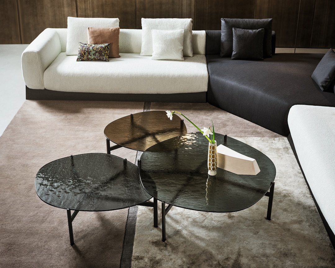Sleek glass tops in extra-clear, smoke grey, lacquered, or anti-scratch velvet finishes in elegant tones