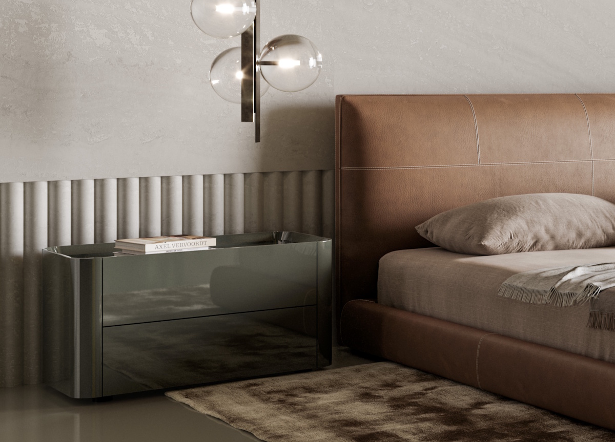 The top is set at a lower level creating a useful integrated tray area, a defining detail that reinforces the collection’s cohesive design identity. Pictured here with the Oris bed which together with the matching Arragan sideboard can be seen in the related products.