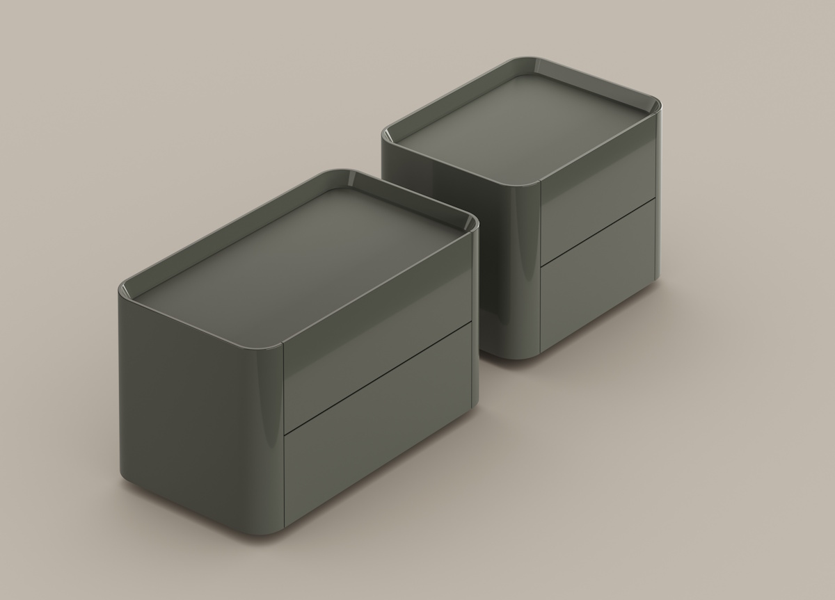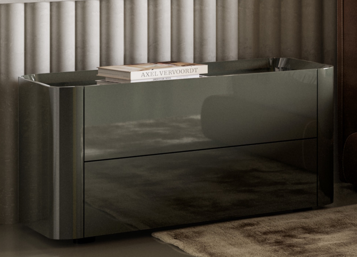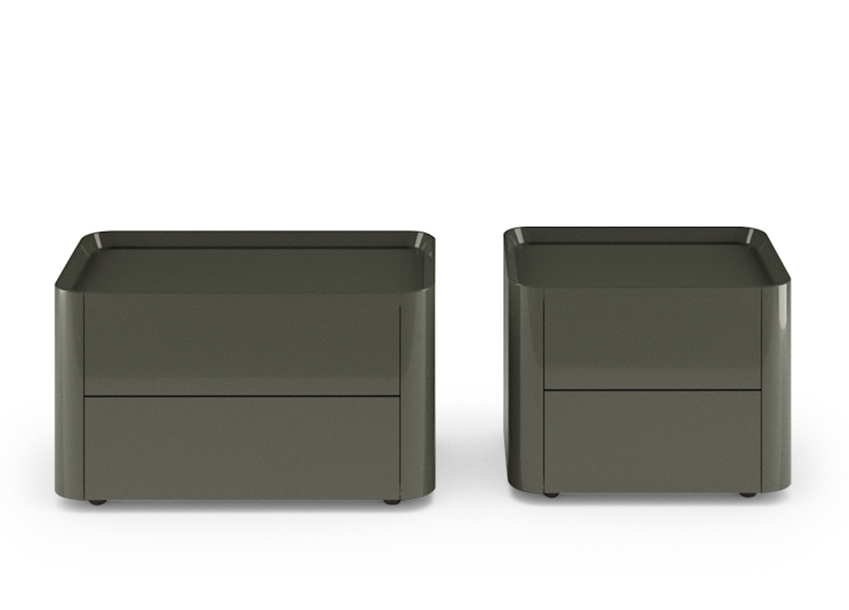 Available in two sizes with two drawers, each of which is set on low black feet which enhance its visual lightness and emphasise its compositional clarity. For the frame you can choose from sandgrey or volcano grey in either matt or gloss lacquered wood, the piece can be further enhanced by a ceramic top in several colours & finishes, or a top in the same finish as the structure.