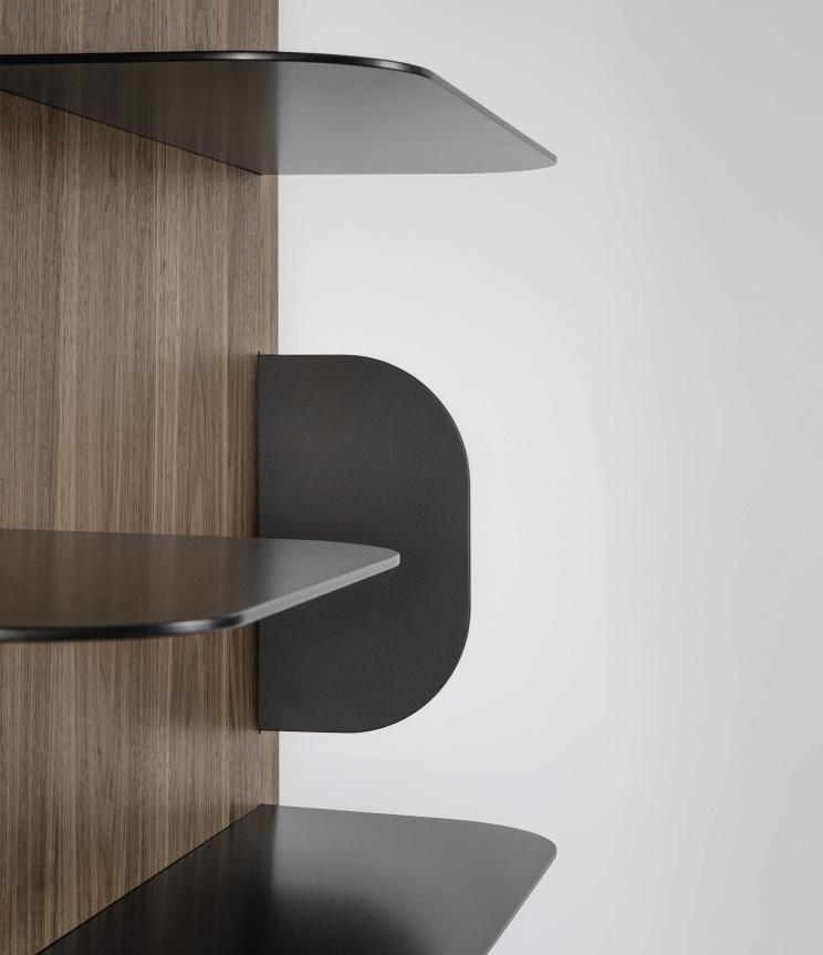 Blabla has a thick back panel in either Canaletto walnut or coal ash wood which contrasts with the slender metal shelves which can be chosen in a range of lacquer colours or metal finishes..