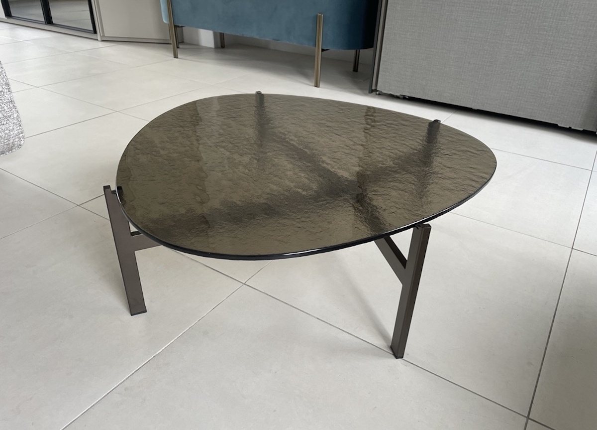 Table top in Bronzed fused tempered glass with Lead metal base.
