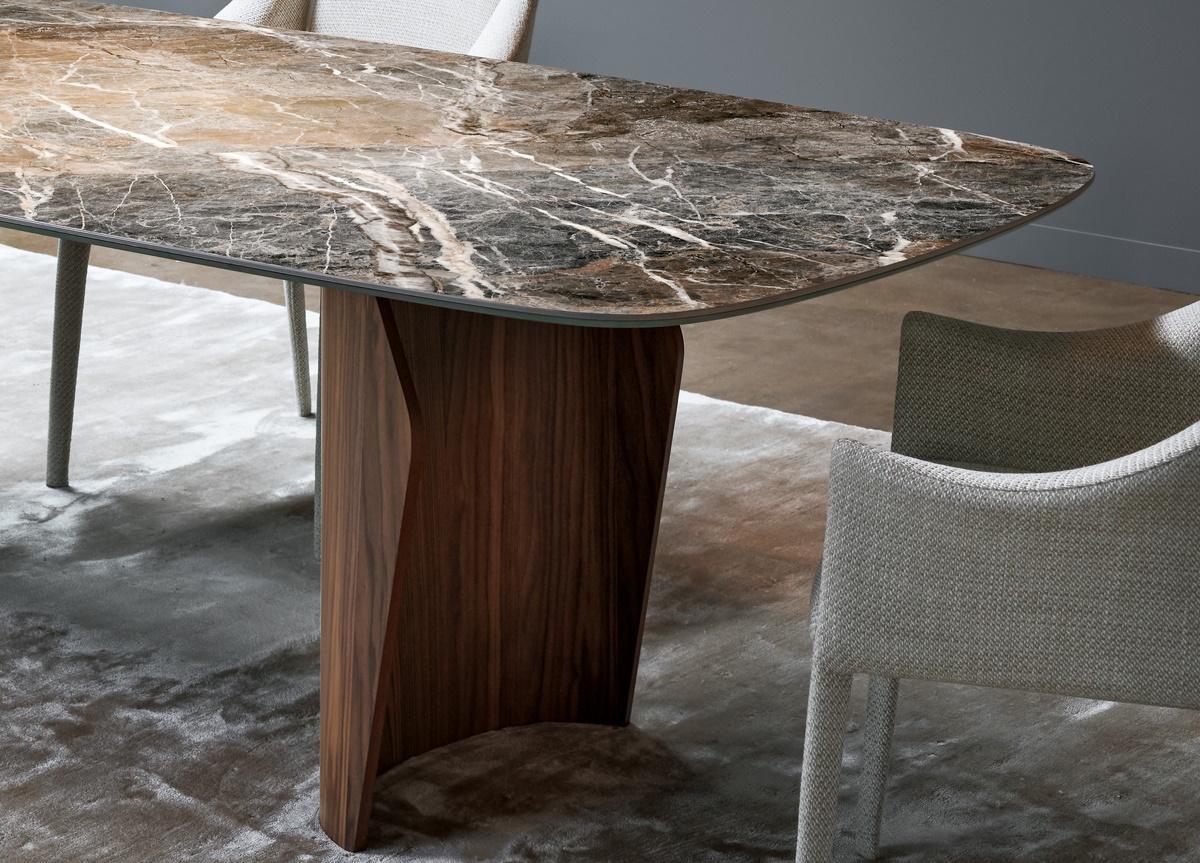 Made in Italy, the table top has lovely rounded corners and is fully usable thanks to the position of the two bases designed to optimise the overall space. The top is available in a number of sophisticated finishes – from wood to ceramic and marble – and you can choose from two different wood options for the base.