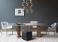 The images show the Flame dining table with a Mountain peak ceramic table top and a Canaletto walnut base matched with the Vela dining chairs which has some Quickship upholstery options. A Flame dining table with a metal base and a console table can be seen in the related products below.