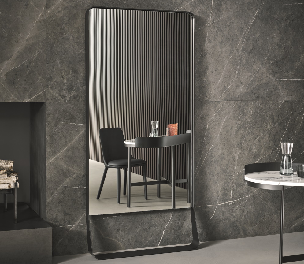 Available in two sizes, the main characteristics of the Narciso mirrors are their rectangular shape and rounded corners. The profile, a metal frame available in several different finishes, is transformed in the bottom section, widening towards the support base, thus creating an empty space between the mirror and the base resting on the floor.