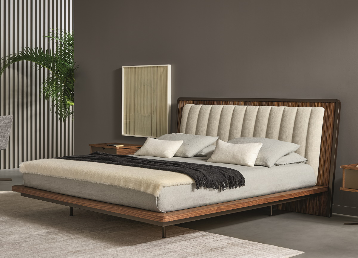 The flat, slimline bed base, also in Canaletto walnut, rests on slender bronze metal feet, which gives the bed the impression of being “suspended” as if it is floating in the bedroom. The headboard edge is in bronze matt lacquered wood to match the feet.