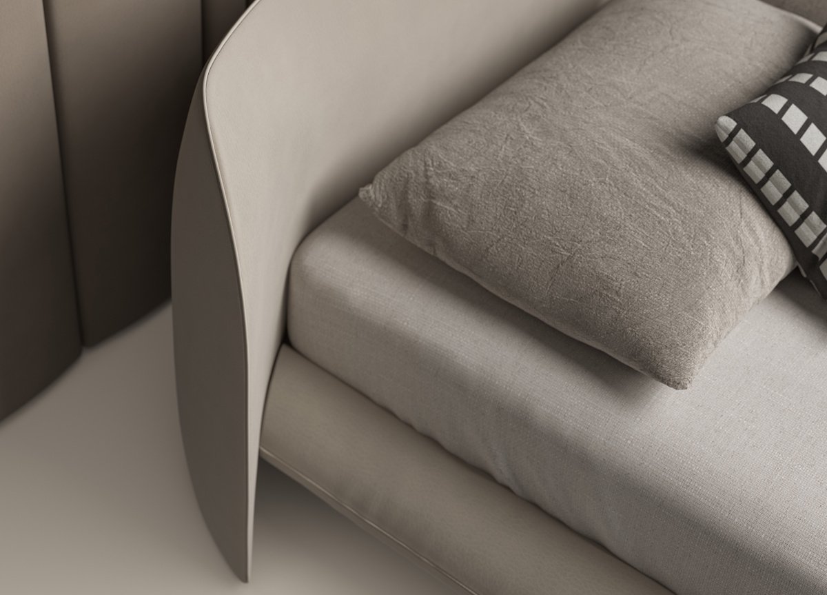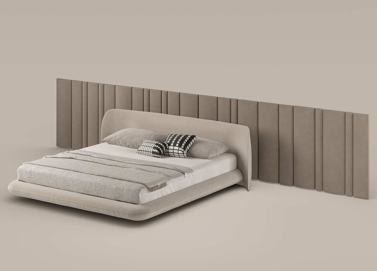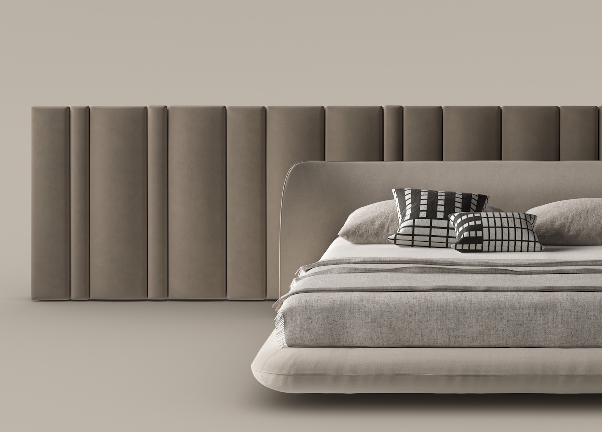 The geometry of the bed's headboard, low and sinuous, recalling the shape of a cloud, naturally welcomes the harmonious frame of the bed and attracts both the gaze and touch, while the fluidity of the undulating curves is an invitation to relax.