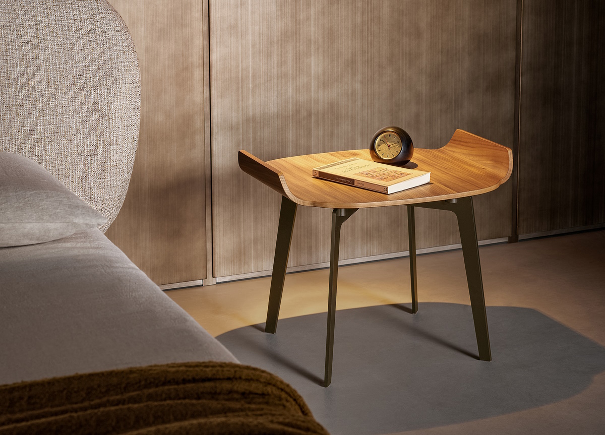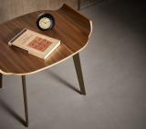 In its formal simplicity, the curved canaletto walnut wood gives the top of the bedside table a sense of sophistication and lightness while the whole piece is supported by long slender bronze metal legs that raise the top and give character to the outline.