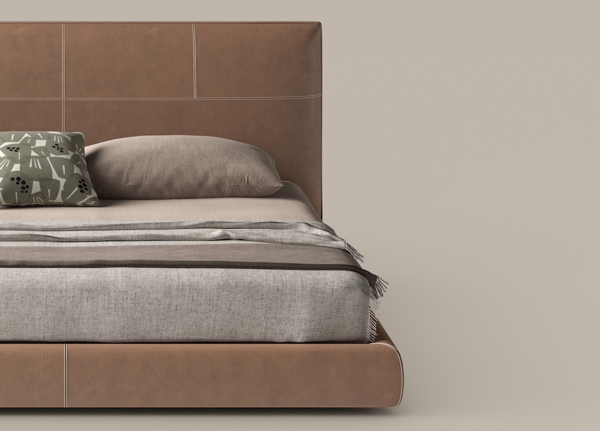 The Bonaldo Oris bed by Gabriele & Oscar Buratti explores the relationship between form and function through a highly expressive yet rigorous aesthetic. The high, square headboard and enveloping side panels that reach the floor give the bed a strong architectural presence.