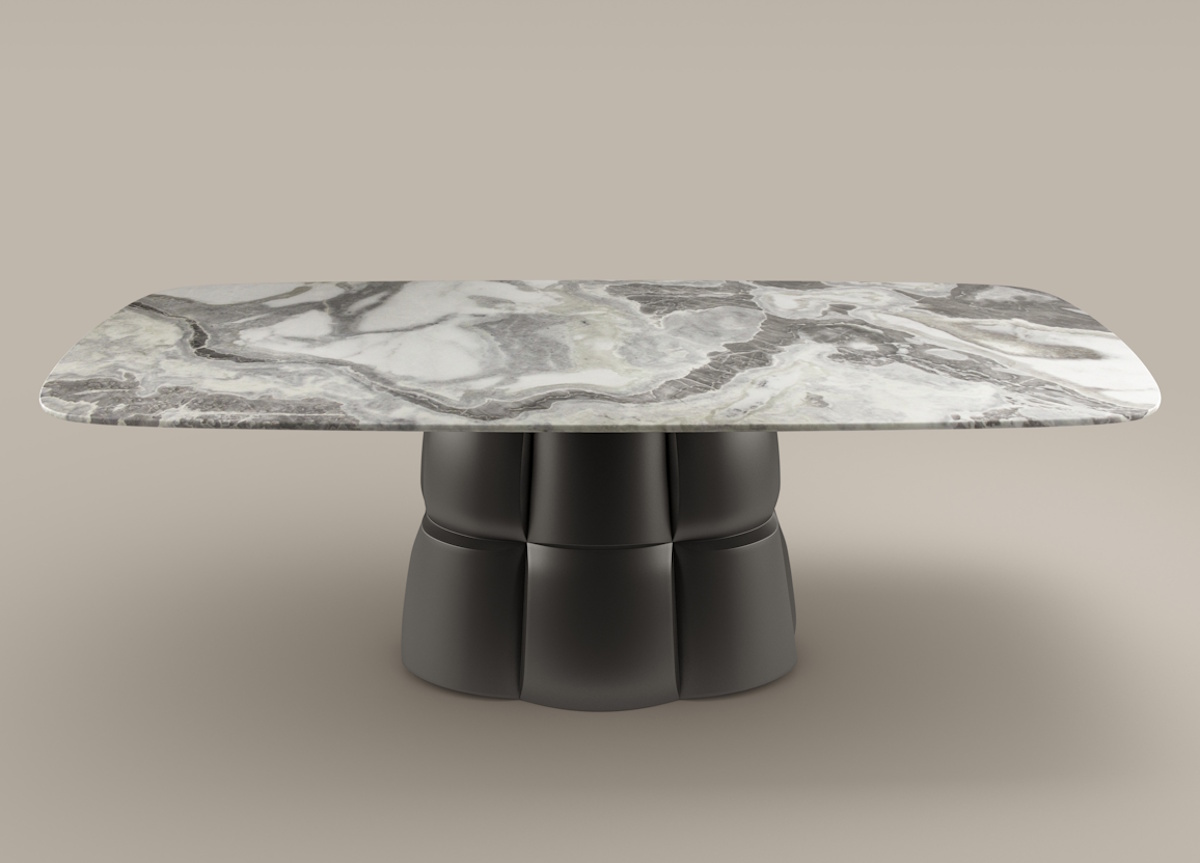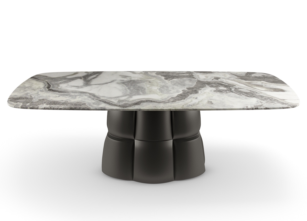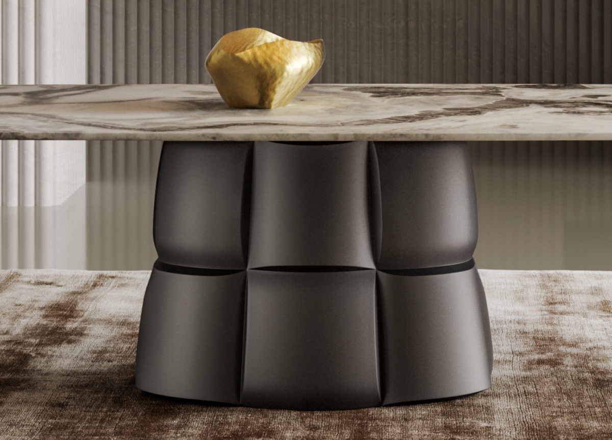 The table’s distinctive barrel-shaped top, available in six sizes, enhances its architectural presence and can be customised in a selection of luxurious finishes, including solid wood, matt, glossy or silk hard-wearing ceramic, or several matt or glossy marble finishes, although not all table top options are available in all sizes & the thickness of the table top depends on the finish chosen. Each option enhances the table’s visual depth and allows you to tailor Palazzo to your personal aesthetic.
