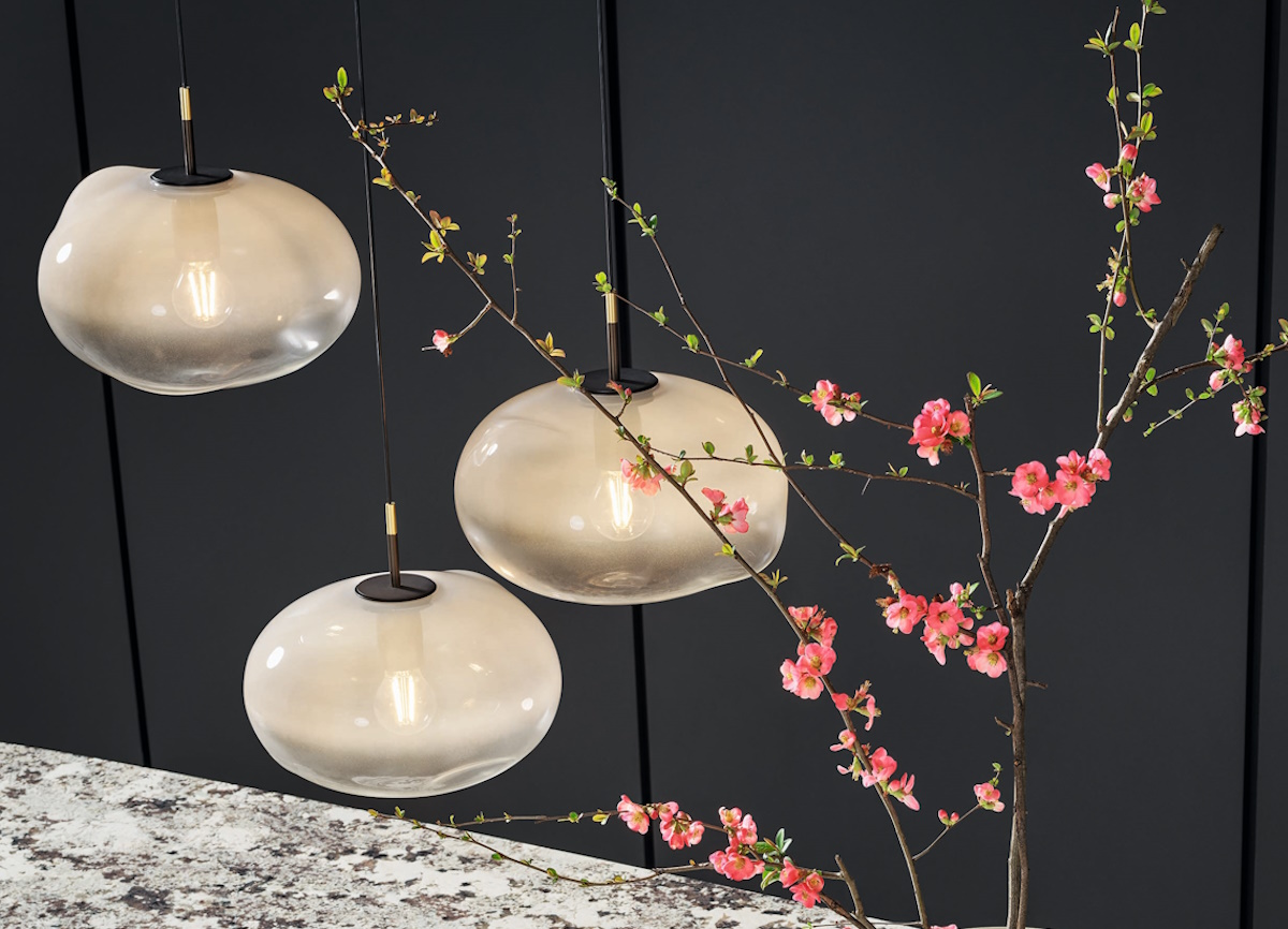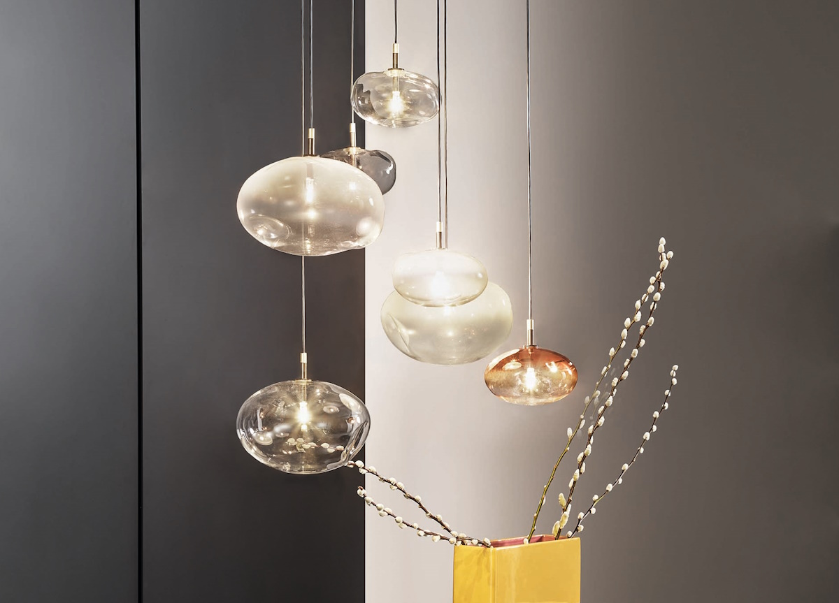 There are three sizes of chandelier to choose from, each enabling you to create different lighting atmospheres depending on the compositions. You can select either three 32cm silk glass shades, or five 22cm shades of which four are silk glass and one is transparent glass; and a seven shade light which is a combination of three 22cm shades (2 silk glass and 1 transparent glass) and four 12cm shades (2 transparent glass, one silk glass and one copper glass).