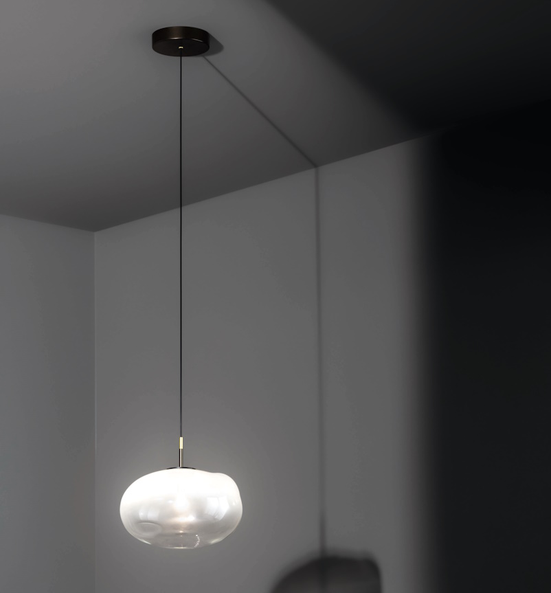 A single suspended light with a silk glass shade, matt brass details and a metal ceiling rose in either bronze or lead. Dimmable