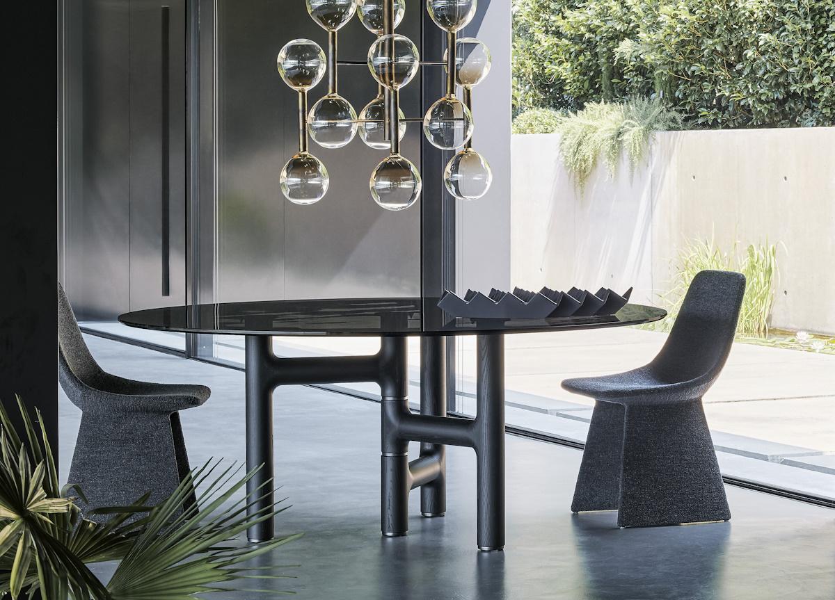 Pictured here with a table top in smoked glass and coal ash legs, the Pivot dining table is seen with the Itala dining chairs which are designed by Gino Carollo, however, this beautiful table will also match any of Bonaldo's other dining chairs. There is also a rectangular version of the Pivot dining table which can be seen in the related products.