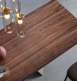 The table shown in the main image has a table top in solid American walnut and a bronze base. There are also several other wood finishes to choose from including veneered walnut & oak, solid coal or natural oak, as well as American Walnut with natural (uneven) edges (please note that this table is not solid wood). Not all finishes are available in all sizes.