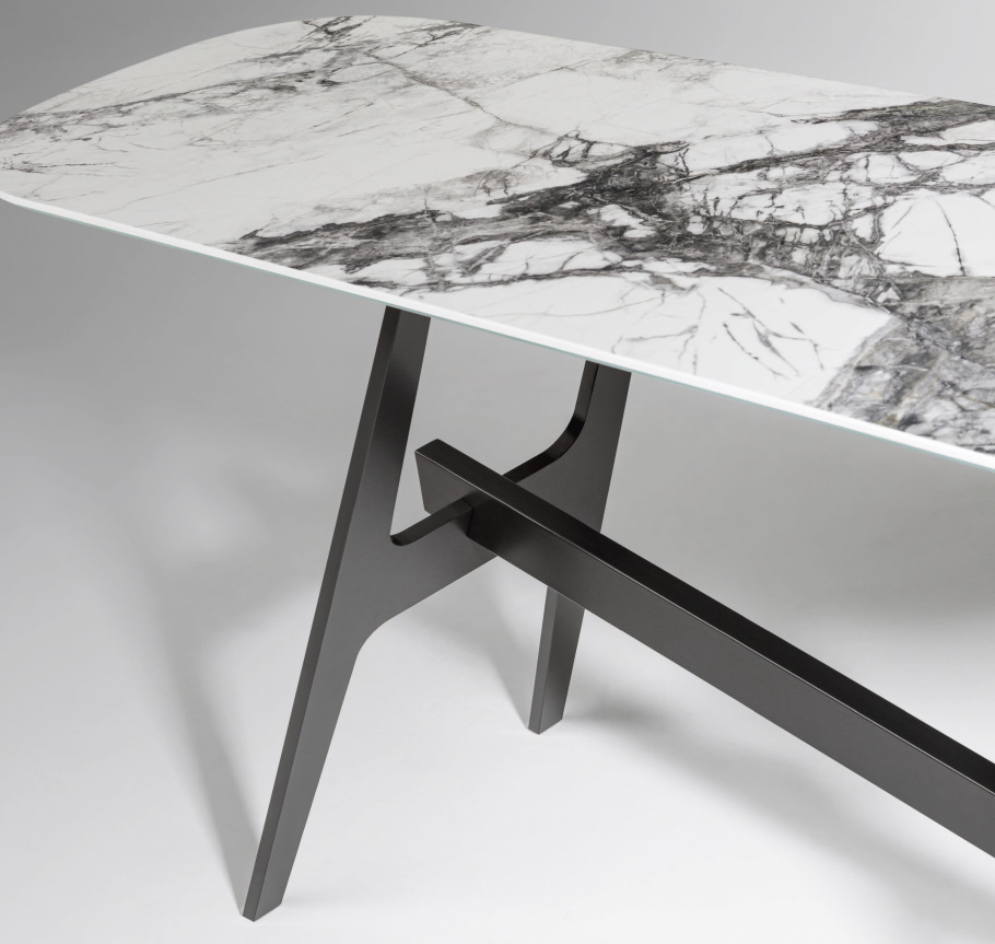 For the table top choose from several ceramic finishes in either matt, glossy or silk finish. The base and central beam can be lacquered in colours including white, anthracite grey and black and metal lacquer finishes including pearl gold.