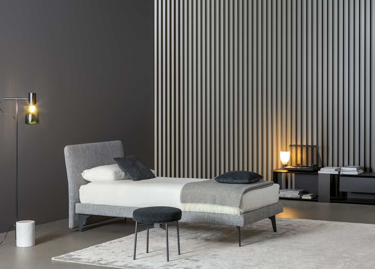 An added feature of this smart single bed are the elegant metal feet which are matt painted or lacquered in Bonaldo's metallic lacquers.