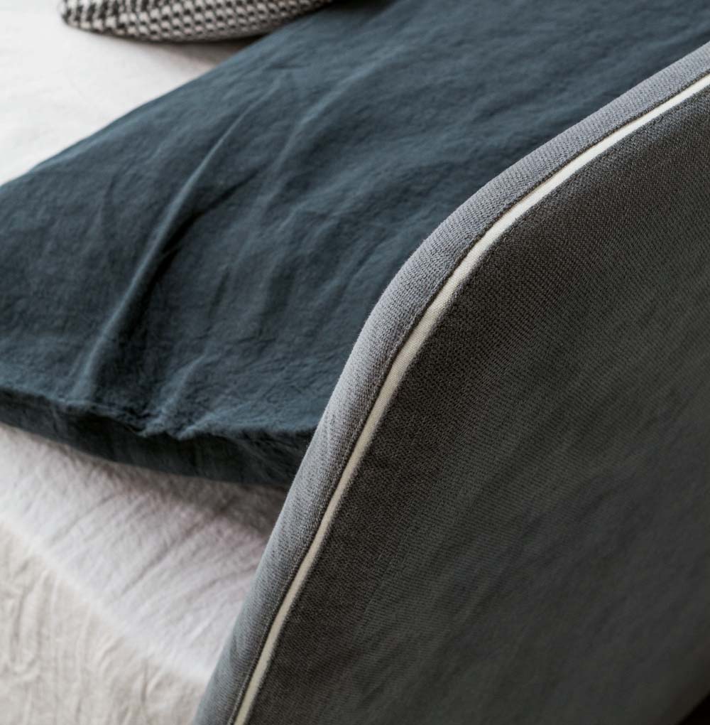 The Bonaldo Tonight king size bed features fabric piping along the gentle curve of the padded headboard and around the base. This elegant contemporary upholstered bed, with its interesting decorative detail, has clean strong lines and is available with either painted wood or matt metal feet.