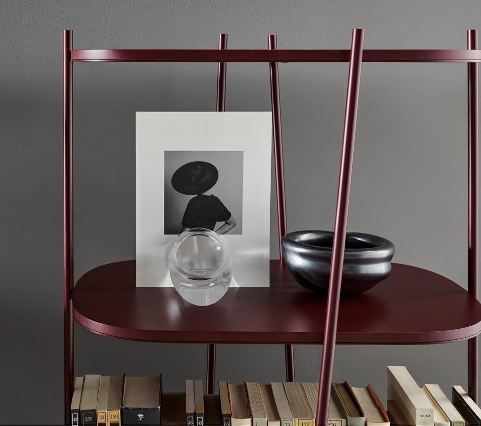 The metal frame can be selected in either bordeaux red, bronze or lead, with the shelves in a matching matt lacquered wood. Maximum capacity is 10kg per shelf.