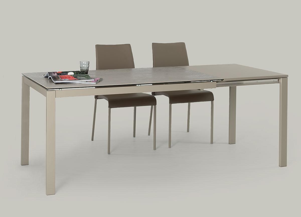 Extending table with top in melamine (wood effect, plain or concrete effect), lacquered glass, scratch resistant velvet glass, ceramic, or ceramic marble. Extensions included, matching for melamine tops, or in plain coloured melamine for glass & ceramic tops. Metal base lacquered in a choice of colours.