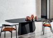 Extending table with top in melamine (wood effect, plain or concrete effect), lacquered glass, scratch resistant velvet glass, SuperCeramic, or SuperMarble. Extensions included are matching for melamine tables, with matt lacquer wood extensions for the glass and Super finishes, and the option of matching Super finishes. Metal frame and legs lacquered in a choice of colours.