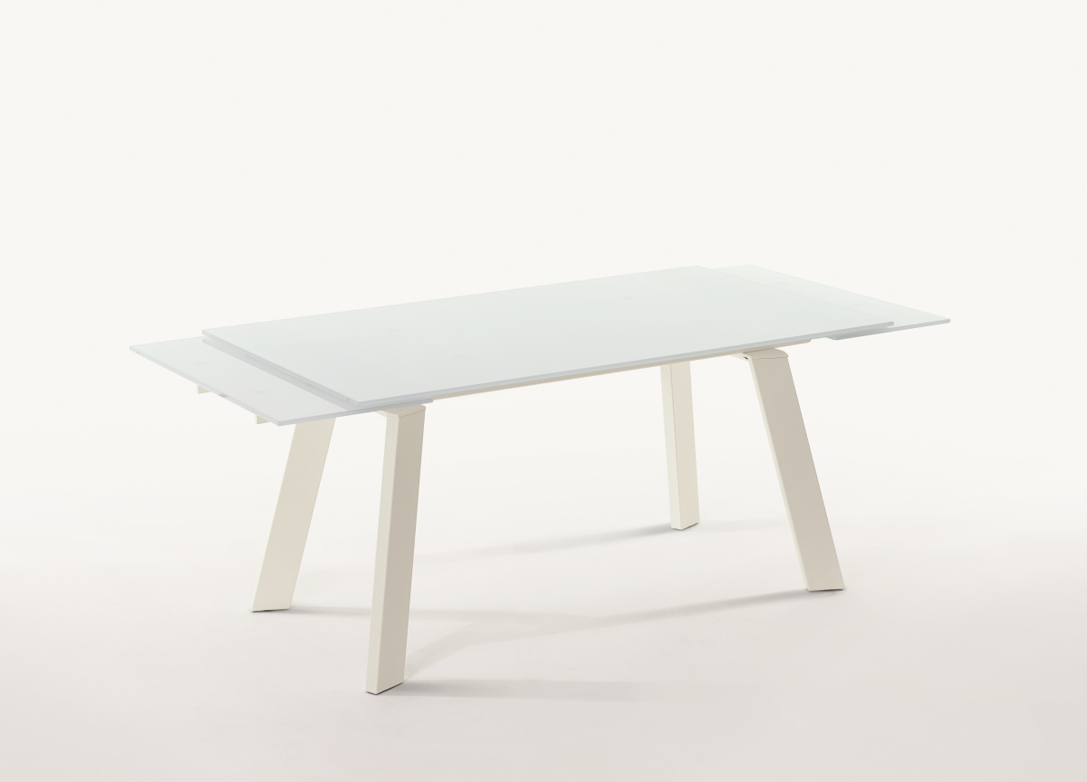 Extending table with top and matching extensions in transparent extra clear glass, transparent smoke grey glass or extra white glossy lacquered glass. Metal frame lacquered in a choice of colours.
