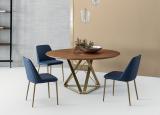 The main image shows the chair with a quilted back in cobalt blue ecoleather with an aged brass frame and coupled with the Delta dining table. There are two other versions of this smart chair, one with a wooden frame and one with armrests, the Margot Armchair, both of which can be seen in the related products.