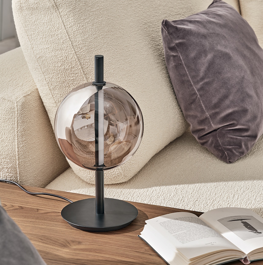 The Bontempi Sferatus table lamp by Studio Design F + B has a partially mirrored borosilicate glass shade which creates an extraordinary play of light and shadow and a brightness-intensifying effect.