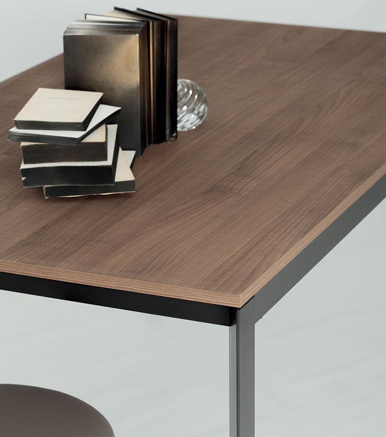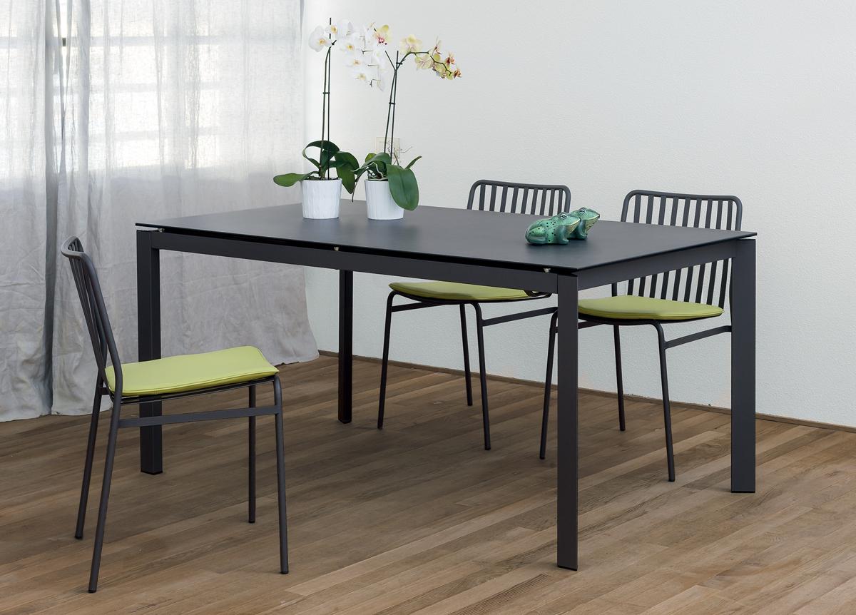Extending table with top in melamine (wood effect, plain or concrete effect), Unicolour (a tough material with a stone finish), lacquered glass, scratch resistant velvet glass, ceramic, or ceramic marble. Extensions included, matching for melamine tops, or in plain coloured melamine for glass & ceramic tops. Metal base lacquered in a choice of colours.