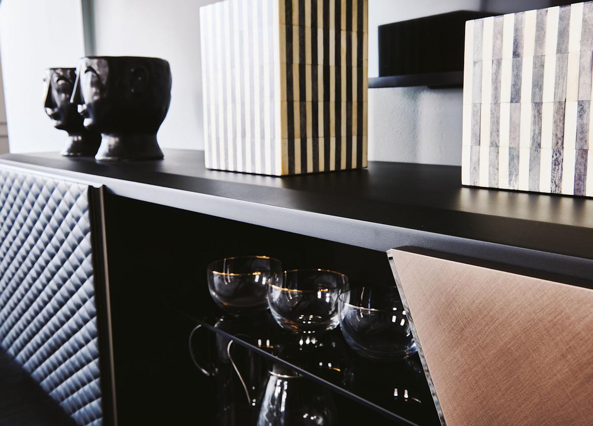 The frame is in black embossed wood with a black embossed steel base. For the left door which has an embossed titanium aluminium profile you can choose any quilted ecoleather or soft leather from the Cattelan collection. The right door which has black chrome details can be selected in Canaletto walnut, burned oak or brushed bronze. Internal shelves are in smoked glass.