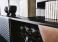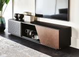 TV cabinet in black (GF73) embossed lacquered wood. Black (GFM73) embossed steel base. Left door covered and quilted in synthetic leather or soft leather as per sample card with titanium (GFM11) embossed aluminum profiles. Right door in Canaletto walnut (NC), burned oak (RB) or Brushed Bronze with black chrome (06) details. Internal fumé glass shelves.