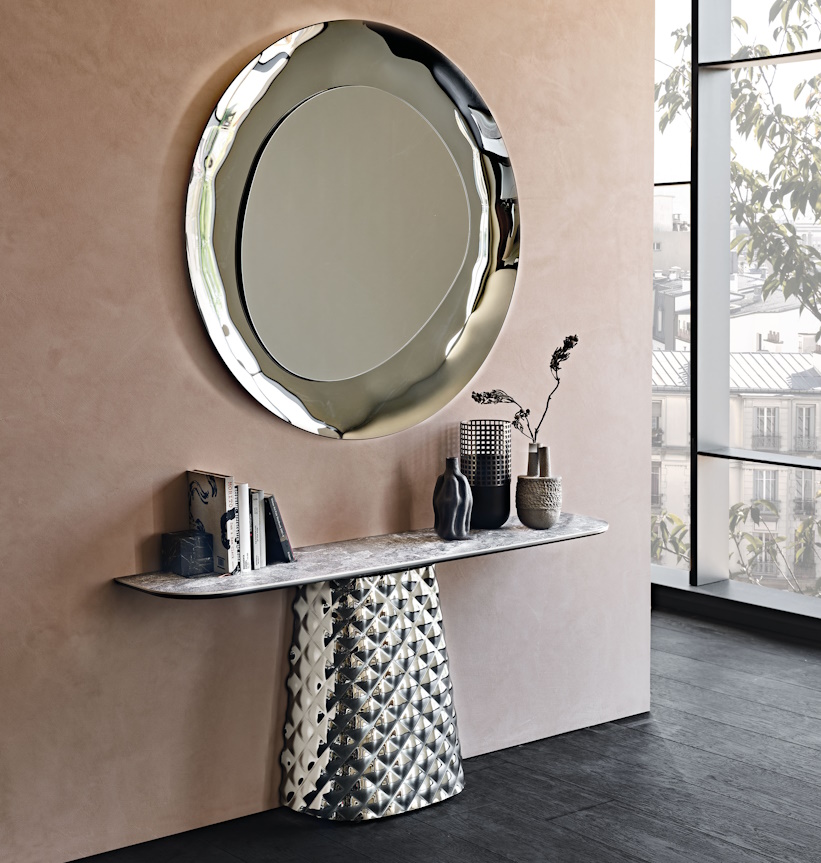 The Cattelan Italia Atrium Keramik console table has a real WOW factor base made from finely worked plates of couture mirrored fumé or bronze glass that gives it a three-dimensional effect similar to quilted fabric.