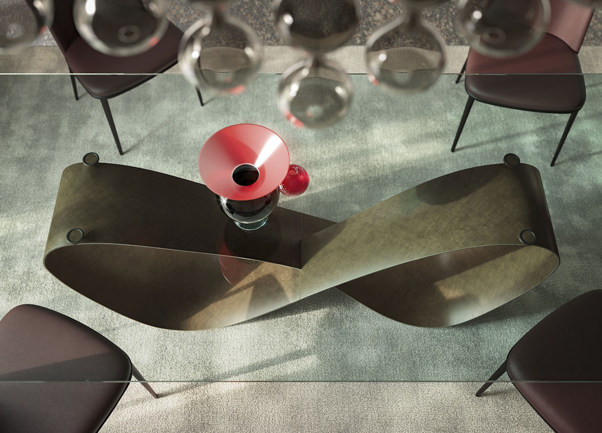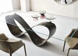 The glass table top is laid on the base and with its fragile appearance it creates a contrast with the bold and revolutionary combination of curves and edges. The glass can be selected in clear glass, extra clear glass, or extra clear glass with reversed bevelled edges (two table sizes only) all of which give a contemporary and light appearance with a generous table top surface providing ample space for dining, working, or entertaining guests. Extra clear glass has been treated to remove the green tinge you get in standard glass.