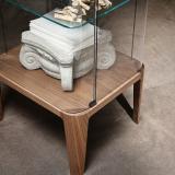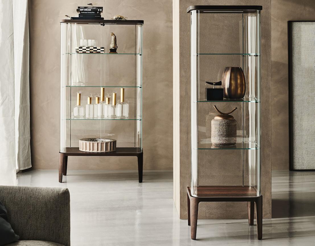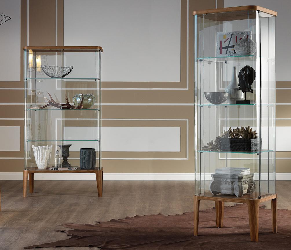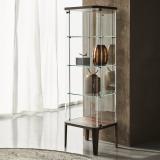 Extra clear glass display cabinet with top and base in Canaletto walnut (NC) or burned oak (RB). Extra clear glass shelves. With led light. Max capacity: each shelf 6kg.
