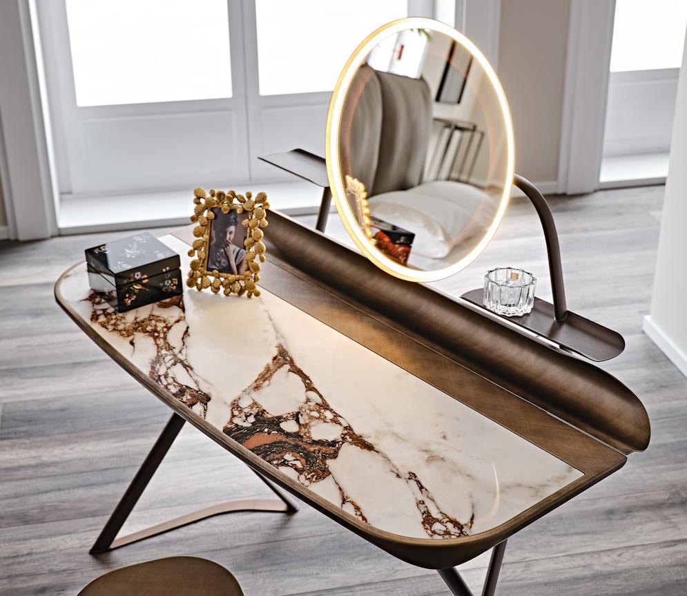 Dressing table with base in titanium (GFM11), bronze (GFM18) or black (GFM73) embossed lacquered steel. Top in ceramic Marmi Alabastro (KM02), Supreme (KM03), matt Golden Calacatta (KM05), glossy Golden Calacatta (KM06), matt Portoro (KM07), glossy Portoro (KM08), glossy Sahara Noir (KM09), Makalu (KM11), Breccia (KM12), Arenal (KM13), Corcovado (KM14), Kaindy (KM16), or Zefiro (KZ20) with Brushed Bronze or Brushed Grey lacquered and rounded lower profile and grooved tray in Brushed Bronze or Brushed Grey lacquered steel.
