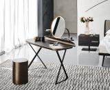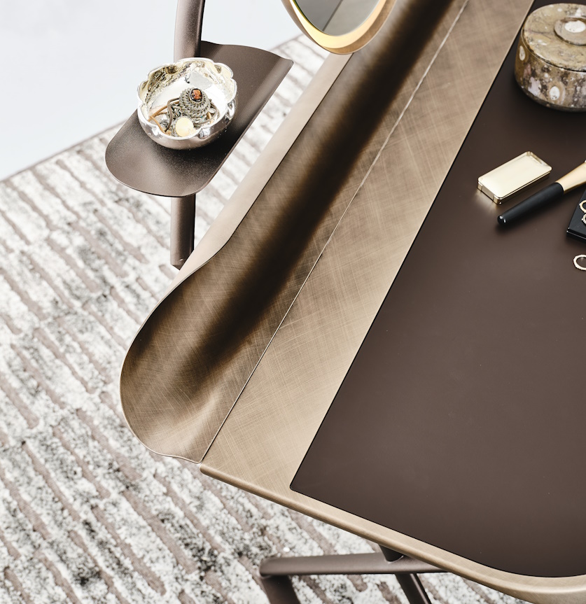 Dressing table with base in titanium (GFM11), bronze (GFM18) or black (GFM73) embossed lacquered steel. Top in leather from the Cattelan Italia collection as per sample card with Brushed Bronze or Brushed Grey lacquered and rounded lower profile and grooved tray in Brushed Bronze or Brushed Grey lacquered steel.