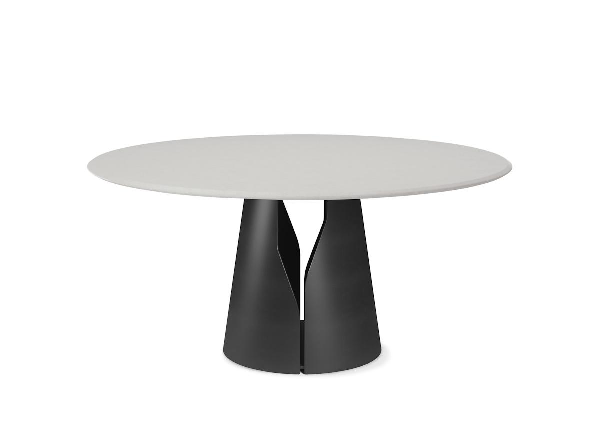 All tables in the Giano collection have a round steel base with a precise opening that allows you to glimpse inside and adding a whimsical touch. The base can be chosen in titanium, bronze, graphite, pearl, or black embossed lacquered steel.