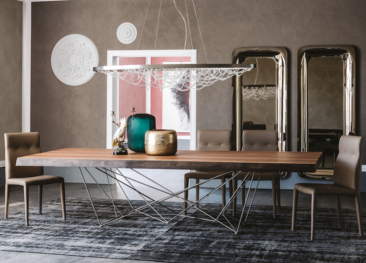 The Cattelan Italia Gordon Deep Wood dining table by Giorgio Cattelan has a look of great strength and grandeur due to its amazing wooden table top in Canaletto Walnut with irregular solid wood edges.