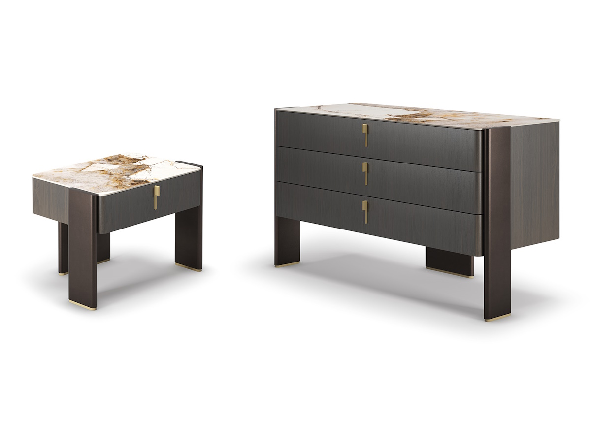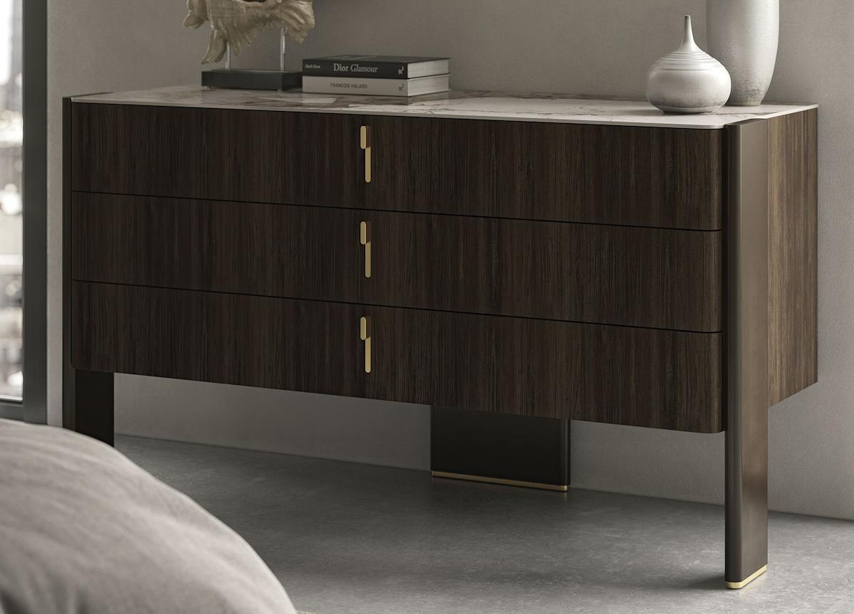Chest of drawers with 3 drawers in Canaletto walnut (NC) or burned oak (RB). Frame in bronze (GF18) laquered wood and details in brass laquered steel. Top in Marmi ceramic in matt Portoro (KM07) or Corcovado (KM14), or bronze mirrored glass.