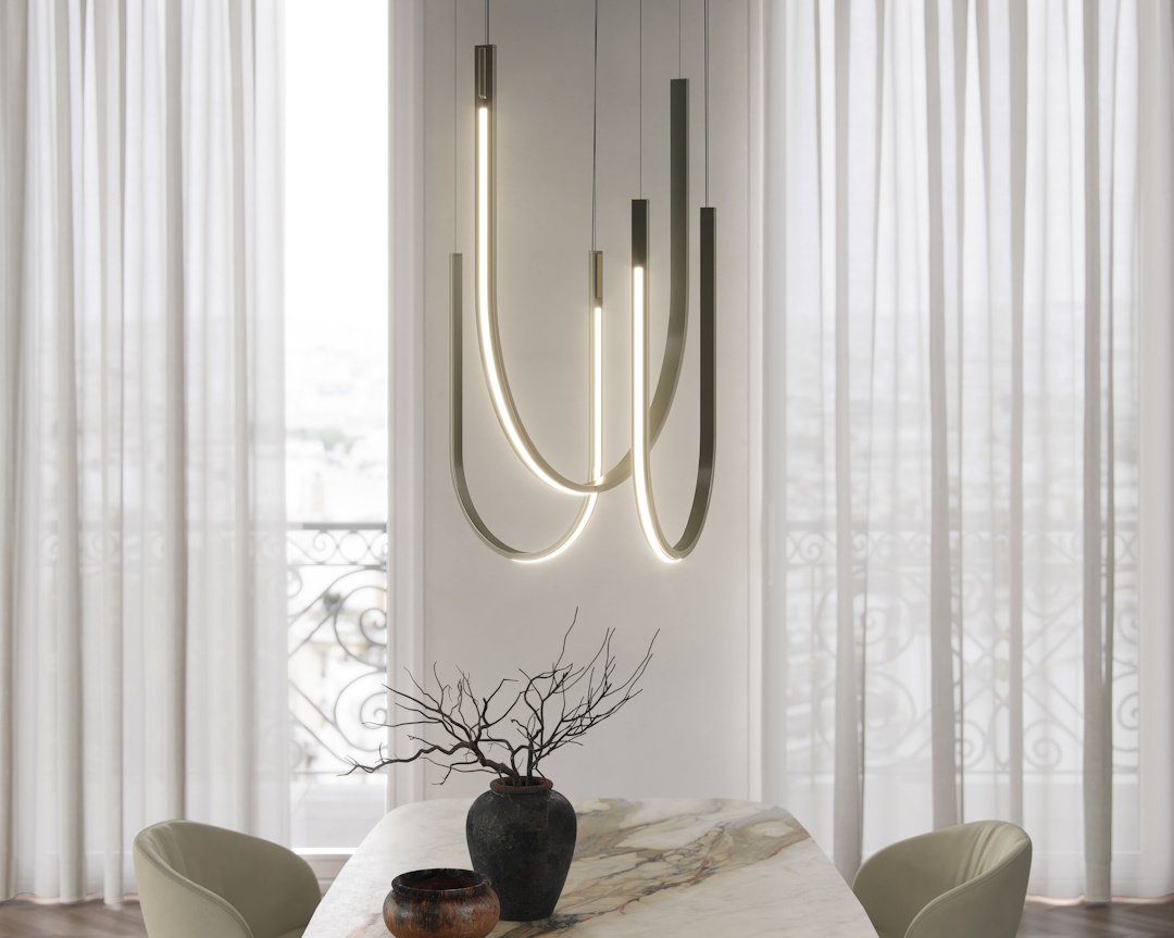 Available in four different sizes, each light is in a curved U-shape that intersects the air creating geometric sections that are reassuring in their mathematical precision. An LED light strip is positioned along the entire outer edge of the lamp, giving a soft and distributed light. At the ends of the structure there are two minute small brass dowels, one of the only decorative elements ensuring a minimalist style that will catch attention.