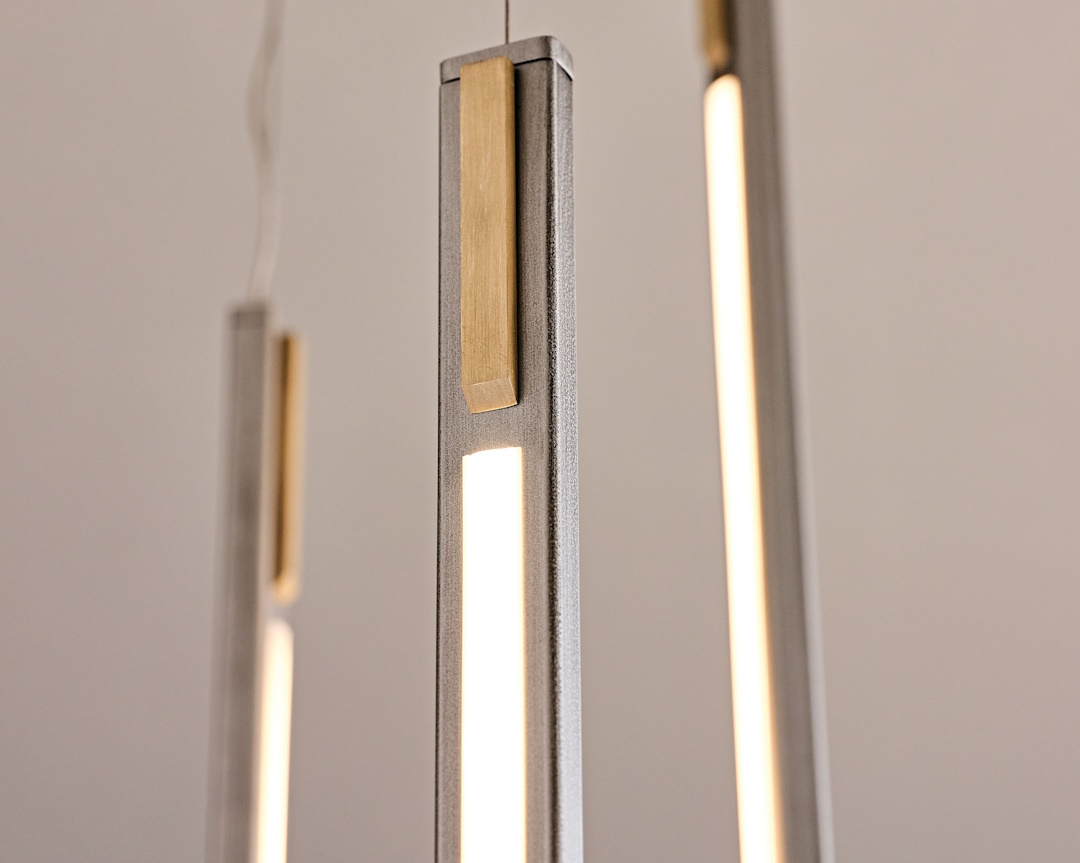 The frame is in satin iron grey embossed lacquered steel with brass details. There is also an optional ceiling plate in black chrome steel, a remote control and receiver are also available, as well as additional cable.