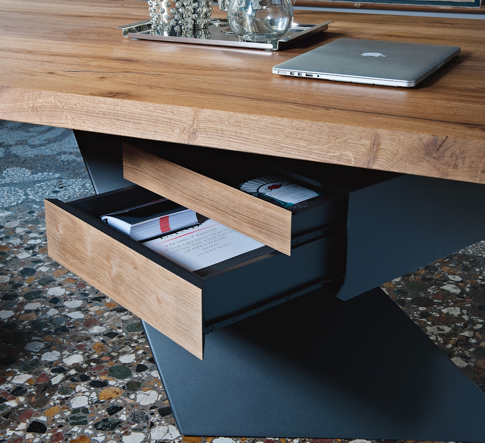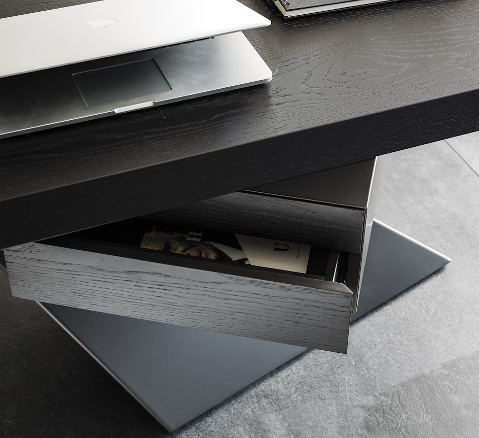 This versatile modern home office desk is available in two sizes and has a beautiful wood table top and side leg which can be selected in several finishes. It also features a wooden side drawer that seems to defy gravity as it is laid the other side leg which is in graphite steel and which cuts through the space with a powerful diagonal.