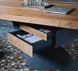 Desk in two sizes with top and drawers in Canaletto walnut (NC), Heritage oak (HR) or open pore matt black Elm (OLM73). Leg in graphite (GFM69) embossed lacquered steel. Leather pad as per sample card.