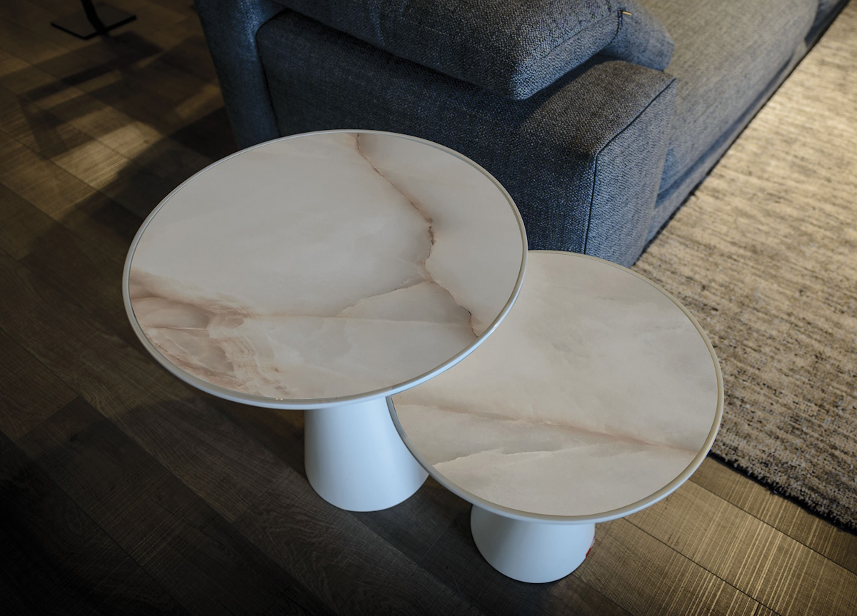 Coffee table with matt white (OP71) or titanium (M11) painted rigid polyurethane. Marmi Alabastro (KM02), matt Portoro (KM07), glossy Portoro (KM08), Makalu (KM11), Breccia (KM12), Arenal (KM13) or Kaindy (KM16) ceramic top.