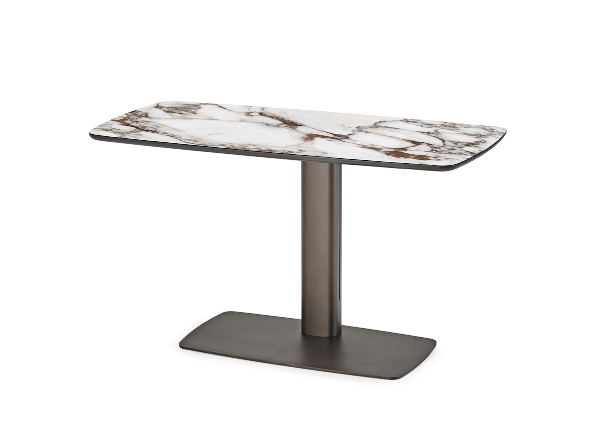 The Keramik table top is made from luxurious Marmi ceramic, an extraordinary material which offers a seamless blend of beauty and practicality, the stunningly beautiful surface has the veins and natural look of marble and can be chosen in several different finishes. The base is available in titanium or bronze embossed lacquered steel.