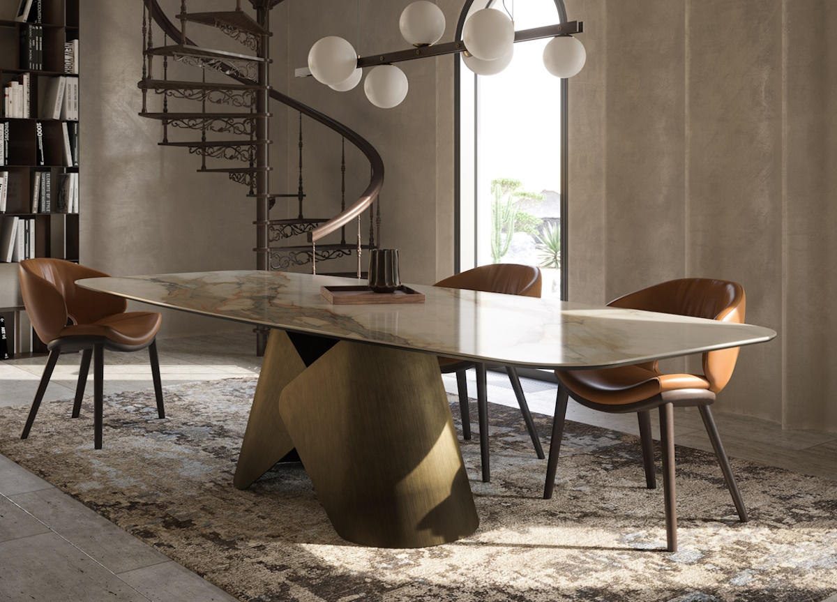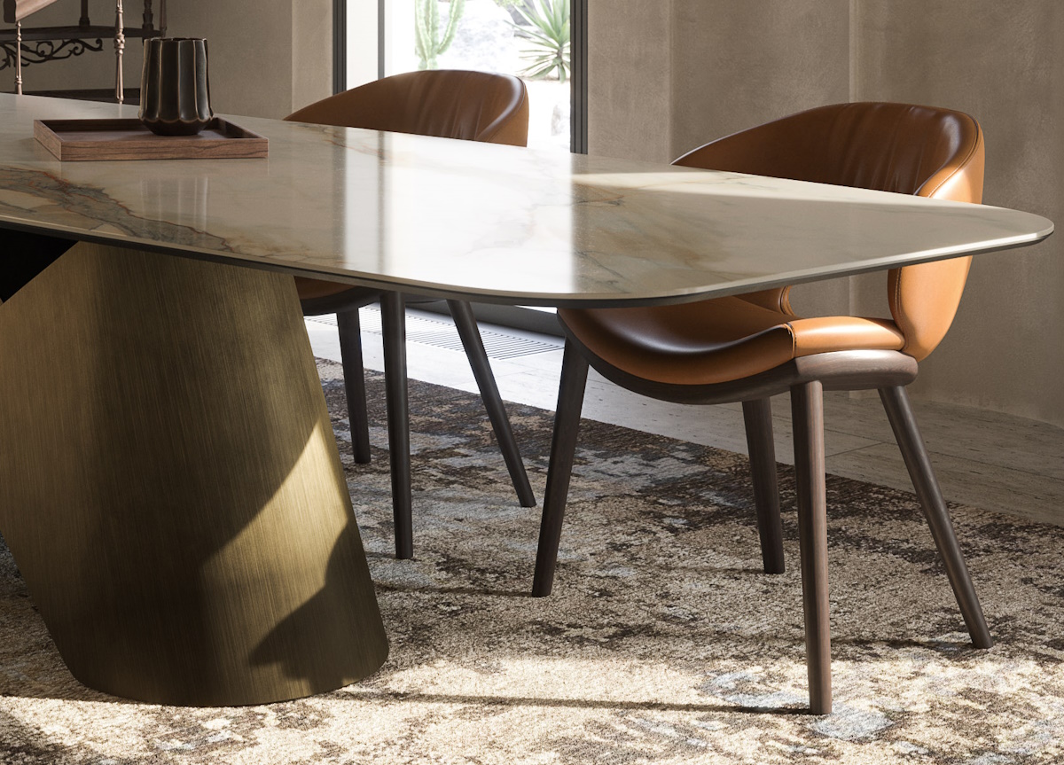 The result is the Scott table which has a stunning central base consisting of two curved and overlapping metal plates, almost like the collar of a shirt. The optical effect is rigid, with well-defined edges that highlight the precision with which the proportions and curves of the two layers have been studied.