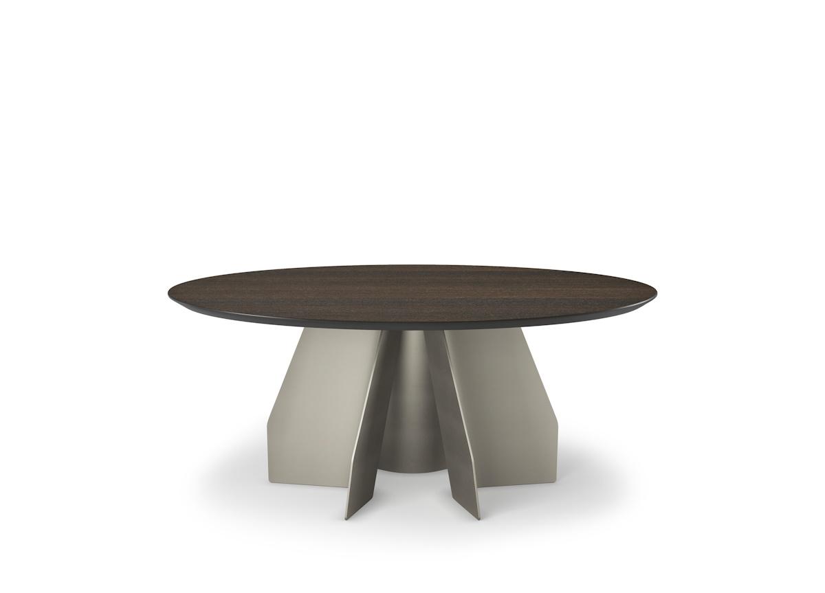 Table with base in titanium (GFM11) or bronze (GFM18) embossed lacquered steel. Top in Canaletto walnut (NC) or burned oak (RB). Optional central swiveling tray Lazy Susan.