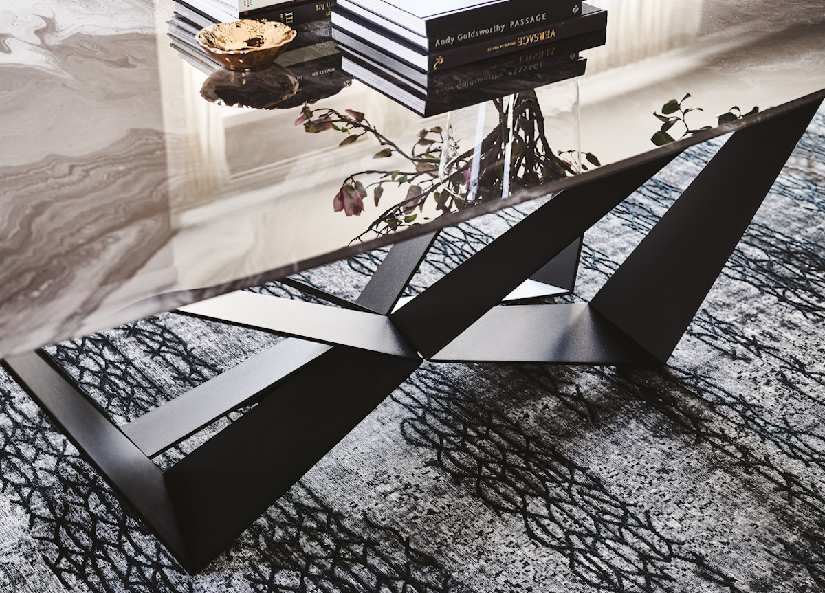 The Cattelan Italia Skorpio CrystalArt dining table has a stunning glass table top which has been printed with a beautiful artistic decorative pattern creating a harmonious geometry of light trails and magical origami.