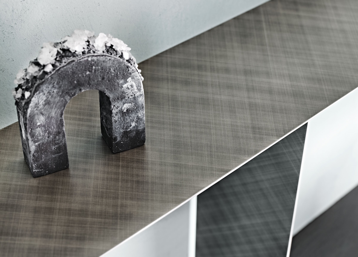 Both the base and top are finished in two choices of a sophisticated Brushed finish, consisting of a special freehand brushing technique. Light scratches, imperceptible to the touch, create a warp and weft metallic decoration.